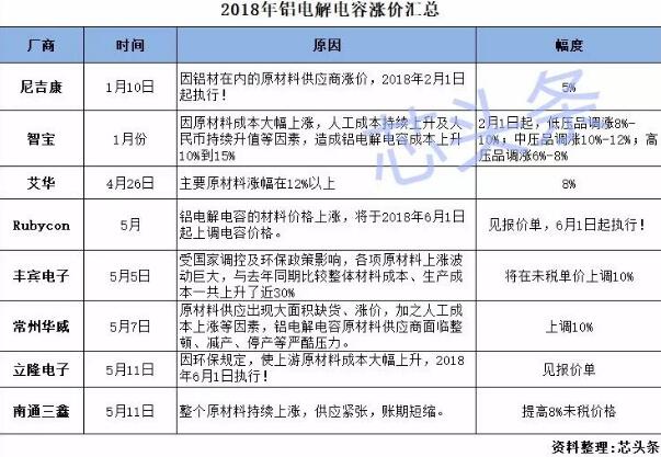 2018年鋁電解電容漲價匯總(僅作為參考)