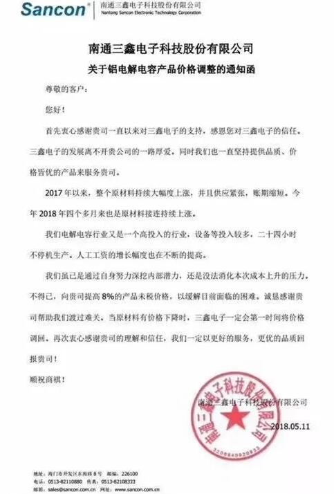 5月11日立隆電子、南通三鑫同時發(fā)出調漲通告