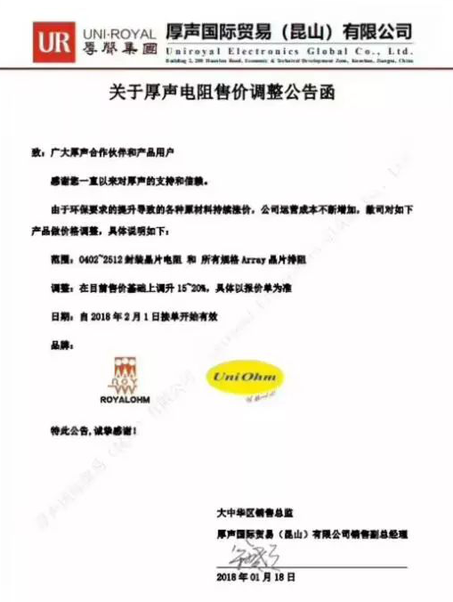 【市場(chǎng)動(dòng)態(tài)】電阻漲價(jià)風(fēng)停不下來電阻價(jià)格上漲15%-20% 厚聲等商家發(fā)漲價(jià)通知